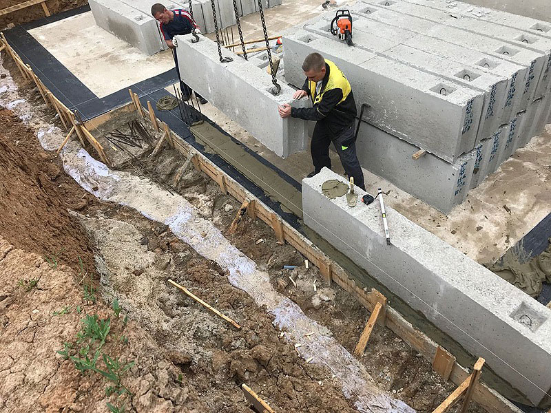 Мы уделяем особое внимание дополнительной теплоизоляции и влагозащите фундамента, поскольку блоки имеют проницаемые стыки, требующие дополнительной защиты