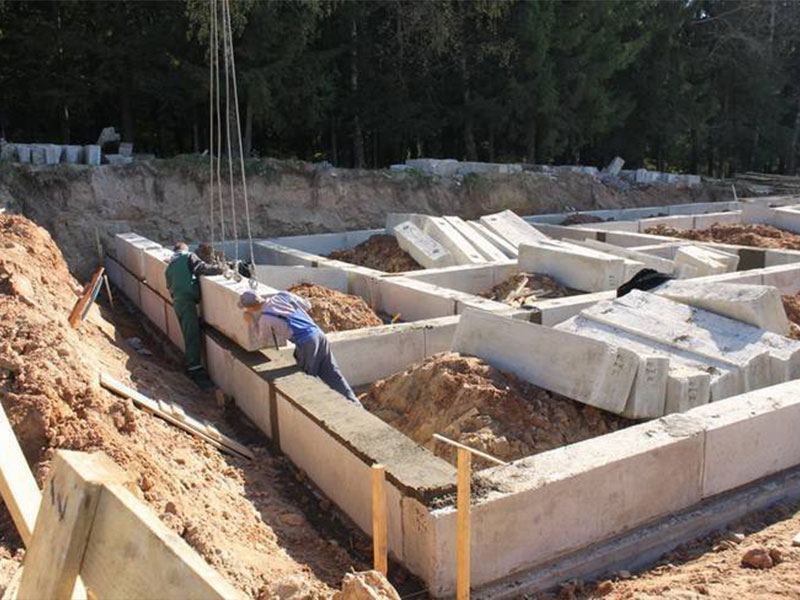 ФБС укладываются на готовое основание и внутри опалубки, образуя стены будущего фундамента.
