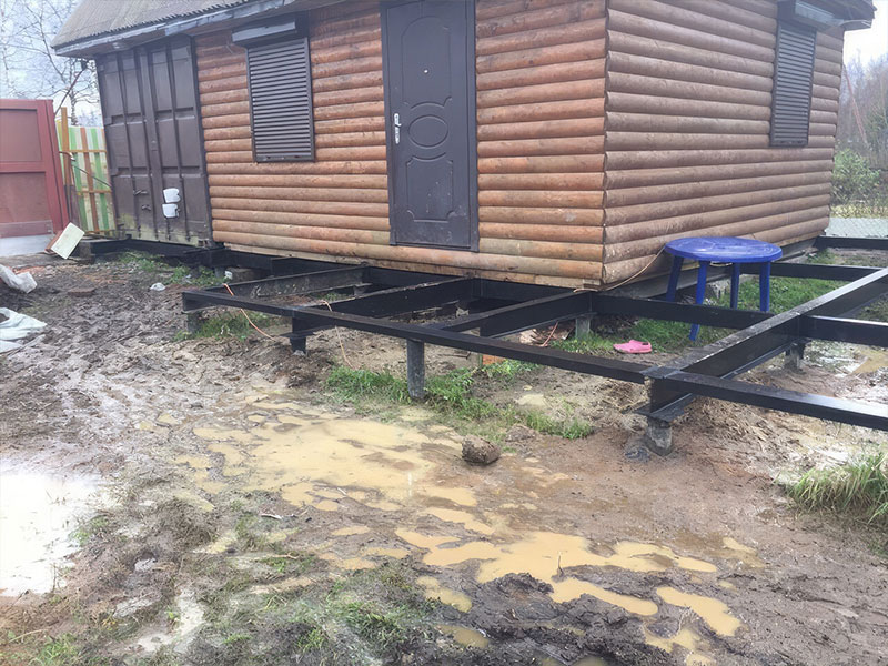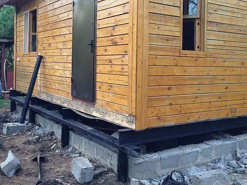 Дом поднимают домкратами, разбирают опоры, ставят на свайно-винтовой фундамент.
